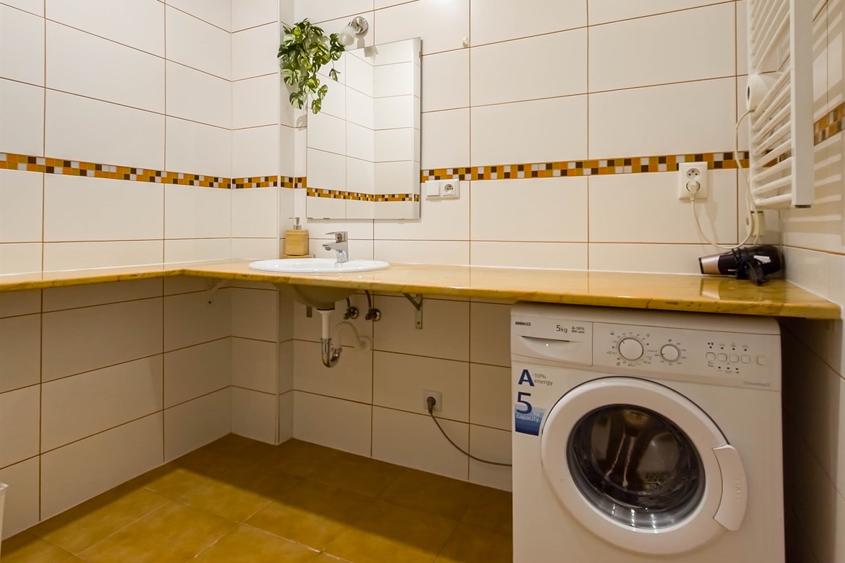 •Bathroom with shower, WC, washing machine, hairdryer, iron and ironing board.
